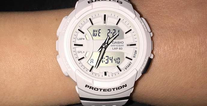 Серия Casio BGA-240 - это новая модель, разработанная для специально для спортсменов предпочитающих бег. Окраска в стиле современной моды на спортивную одежду, часовые метки, разработанные для удобства чтения. Полоса ремешка пробита дырами, создавая мотив, напоминающий сегодняшние элементы спортивной моды, данной дизайнерское решение также позволяет воздуху проходить через охлаждение во время занятий спортом. Протектор на ремешке усиливает прилегание к запястью. Память на 60 этапов - измеренное общее время, прошедшее с начала тренировки или гонки, и промежуточное время можно сохранить с указанием даты и отобразить эти данные позже. Все для удобство замеров скорости и темпа вашей тренировки. Ударопрочные. Ударопрочная конструкция защищает от ударов и вибрации.Светодиодная автоподсветка. Светодиод подсвечивает дисплей часов. При повороте часов в сторону лица подсветка дисплея осуществляется автоматически, благодаря функции «Автоподсветка».Необрит Специальное покрытие обеспечивает длительное послесвечение в темноте даже после кратковременного нахождения на свету.Формат времени 12/24 Время может отображаться как в 12-часовом, так и в 24-часовом формате. Секундомер с двумя точностями показаний: 1/100с (до 1ч) и 1с (после 1ч) и временем измерения 100ч.  Сплит-таймер Память на 60 этапов - измеренное общее время, прошедшее с начала тренировки или гонки, и промежуточное время можно сохранить с указанием даты и отобразить эти данные позже. Таймер обратного отсчета (1 мин. макс. 24 час.) Секундомер, работающий в обратном направлении: при окончании отсчета (0 минут, 0 секунд) издается 10 секундный сигнал. Цифры указывают интервал и максимальное время для установок обратного отсчета.Таймер с автоповтором. Включение/выключение звука кнопок При желании звук кнопок при переходе из одного режима в другой может быть выключен. При этом звук будильника и таймера обратного отсчета будет работать независимо от этого.Ежедневный сигнал, ежечасный сигнал (4) Ежедневный сигнал звучит каждый день в установленное вами время. Число показывает, сколько ежедневных сигналов имеется. Функция ежечасного сигнала обеспечивает подачу звукового сигнала при наступлении каждого нового часа.Ежечасный сигнал Подача сигнала при наступлении каждого новго часа.Будильник SNOOZE. Функция позволяет повторять сигналы будильника через определенный интервал времени. Например, Вы установили сигнал будильника на 07:00. Будильник сработал в указанное время, но Вы не проснулись. Тогда включается функция snooze и через несколько минут будильник срабатывает снова.Полностью автоматический календарь Автоматически учитываются месяцы разной продолжительности и високосные годы.