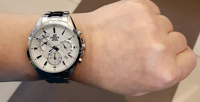 Модель Casio Ediffice из нержавеющей стали с перламутровым циферблатом, с тремя дополнительными окошками, одно из которых напоминает приборную панель.