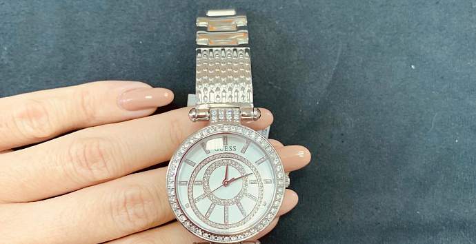 Безель часов усыпан кристаллами.