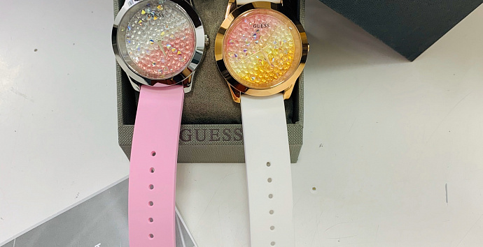 Яркие часы, украшенные россыпью прозрачных кристаллов,