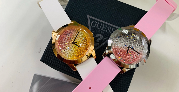 Яркие часы, украшенные россыпью прозрачных кристаллов,