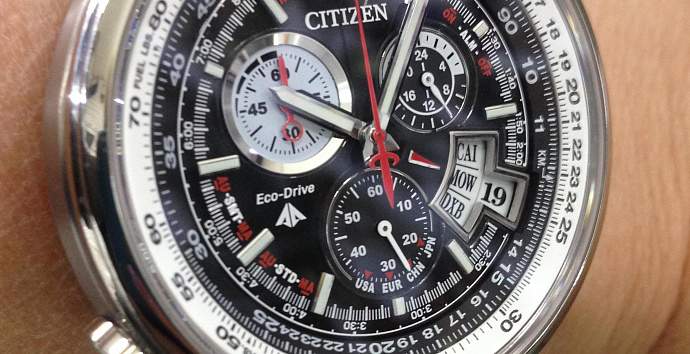 Формат времени 12/24 Время может отображаться как в 12-часовом, так и в 24-часовом формате.Питание от солнечной энергии. Аккумулируя световую энергию, солнечная панель обеспечивает питание для работы часов.Кольцевая батарея Eco-Drive. Солнечная батарея выполнена в виде цилиндра по краю циферблатаХронограф Часы с двумя незвисимыми системами измерения. Одна измеряет короткие промежутки времени, в то время как другая показывает текущее время.Тахиметр Шкала тахиметра для измерения средней скорости движения. Тахиметр предназначен для расчета скорости на основании времени в пути. Чтобы его использовать, нужно запустить хронограф (либо начать измерение, когда секундная стрелка находится у нулевой отметки). После преодоления дистанции в 1 км хронограф останавливают (либо засекают положение секундной стрелки). Отметка на тахиметрической шкале, напротив которой остановилась секундная стрелка, и есть скорость в км/ч.Отображение даты Отображение текущей даты в аналоговых часах.Двойное время Одновременное отображение текущего времени в двух разных часовых поясах.Неоновая подсветка. Подсветка в часах эмитирует ультрафиолетовый свет. Дисплей и стрелки имеют флюорисцентное напыление. В результате этого создается специальный световой эффект, выделяющий каждую из цифр на дисплее.Секундомер (макс. 1 час) Точное измерение истекшего времени касанием кнопки. Дробь соответствует величине, с точностью до которой производится измерение, а число часов - максимально измеряемому времени.Логарифмическая линейка Используя функции логарифмической линейки возможны измерения различных величин, к примеру скорости, дистанции полета или расчет потраченного топлива. Функция логарифмической линейки, как правило, используется в авиационных часах.Мировое время Обеспечивает отображение текущего времени в некоторых городах и определенных регионах мира.Застежка с тройным сгибом, расстегиваемая одним касанием.