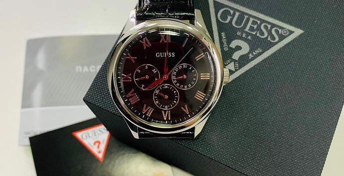 Корпус модели из нержавеющей стали, кожаный ремешок, циферблат с тремя дополнительными окошками с указаниям дня недели, текущей датой и форматом времени 12/24 часа.